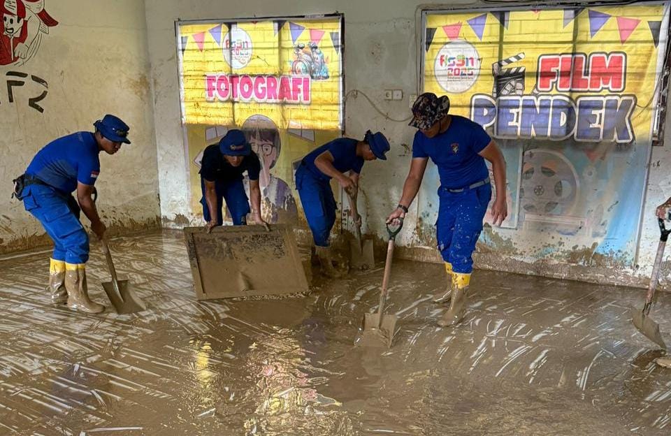 Kegiatan yang berlangsung sejak pukul 08.00 WIB hingga 16.00 WIB tersebut difokuskan pada pembersihan ruang kelas, halaman sekolah, serta fasilitas pendukung lainnya agar dapat kembali digunakan untuk kegiatan belajar mengajar.